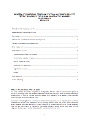 This policy has been developed in recognition of the high rates of human rights abuses experienced globally by individuals who engage in sex work; a term that Amnesty International uses only in regard to consensual exchanges between adults. It identifies the most prominent barriers to the realization of sex workers’ human rights and underlines states’ obligations to address them.