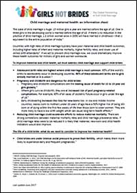 Written by Girls Not Brides, this information sheet takes a look at the link between child marriage and maternal health. It highlights that countries with high rates of child marriage typically have poor maternal and child health outcomes including higher rates of infant and maternal mortality. The brief also looks at what can be done to improve the maternal health of adolescent girls.