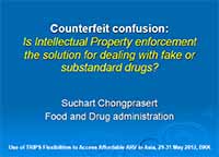 Presentation on Counterfeit confusion: Is Intellectual Property enforcement the solution for dealing with fake or substandard drugs? at Regional Consultation and Planning Workshop “Use of TRIPS Flexibilities to Access Affordable ARVs in Asia” Bangkok 29-31 May 2012