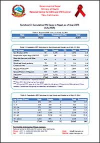 Fact Sheets - Released in 2016 Cumulative HIV Cases in Nepal as of July 2016 Downloads Download Fact Sheets(444.08 KB) Organizations Ministry of Health - Nepal National Centre for AIDS and STD Control (NCASC) - Nepal