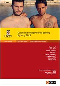 The Sydney Gay Community Periodic Survey is a cross-sectional survey of gay and homosexually active men recruited at a range of gay community sites in Sydney. Since 1996, the project has been funded by the NSW Ministry of Health and supported by ACON and Positive Life NSW. The major aim of the survey is to provide data on sexual, drug use and testing practices related to the transmission of HIV and other sexually transmissible infections (STIs) among gay men in Sydney. The data presented in this report are from the period 2011 to 2015.