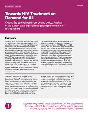 This report, assembled by activists, clinical providers, people living with HIV, and public health practitioners, provides a global overview of the key advances in science, the current state of practice regarding the initiation of HIV treatment around the world, and the policy barriers to ensuring universal access to treatment on demand for all people living with HIV, everywhere.