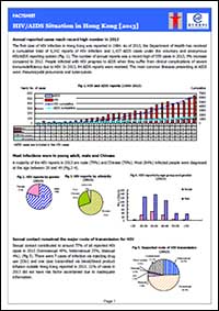 The first case of HIV infection in Hong Kong was reported in 1984. As of 2013, the Department of Health has received a cumulative total of 6,342 reports of HIV infection and 1,437 AIDS cases under the voluntary and anonymous HIV/AIDS reporting system. The number of annual reports was a record high of 559 cases in 2013, 9% increase compared to 2012. People infected with HIV progress to AIDS when they suffer from clinical complications of severe immunodeficiency due to HIV. In 2013, 84 AIDS reports were received. The most common illnesses presenting at AIDS were Pneumocystis pneumonia and tuberculosis.