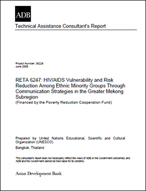 ADB Regional Technical Assistance (RETA 6247) was financed by the Poverty Reduction Cooperation Fund from the United Kingdom's Department for International Development, with parallel financing from UNESCO. This RETA 6247 was, in part, a continuation of the previous RETA (RETA 6083, ICT and Preventive Education in the Cross-border Areas of the Greater Mekong Sub-region). However, it also built and expanded on the lessons identified from the previous project. The earlier RETA, jointly carried out by the Asian Development Bank (ADB), UNESCO and SEAMEO, was implemented during the period April 2003 to September 2004. Under it, ADB/UNESCO pioneered the use of linguistically and culturally appropriate materials in the form of radio soap operas (dramas) for transmitting HIV/AIDS, drug and trafficking prevention information to highly vulnerable ethnic minority populations often living in remote areas in the Greater Mekong Sub-region (GMS). It further established the use of Geographic Information Systems (GIS) for mapping, tracking and monitoring the spread of HIV/AIDS in Thailand, as well initiating the UNESCO-based Clearing House (CH) on Preventive HIV/AIDS education in the GMS.