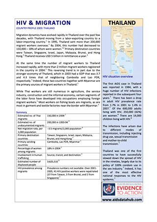 Migration dynamics have evolved rapidly in Thailand over the past few decades, with Thailand moving from a labor‐exporting country to a labor‐importing country. In 1995, Thailand sent more than 200,000 migrant workers overseas. By 2004, this number had decreased to 150,000 – 18% of whom were women. Primary destination countries were Taiwan, Singapore, Israel, Japan, Malaysia, Brunei, and Hong Kong. Thailand receives USD 5 billion in remittances a year.