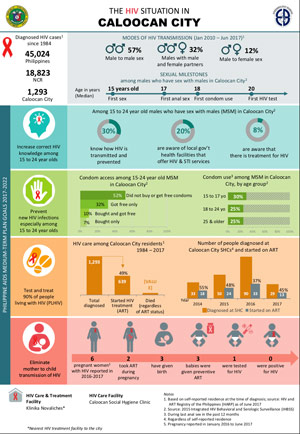 Fact Sheets - Released in 2017 This HIV Situation Brief provides situation information on the mode of HIV transmission, HIV knowledge, men who have sex with men, condom use, treatment, testing in the Philippines. Downloads doh-hiv-situation-brief-philippines-2017.pdf(1.09 MB)