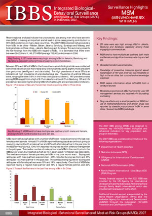 Recent regional analyses indicate that unprotected sex among men who have sex with men (MSM) is making an important and at least in some cases growing contribution to HIV/AIDS epidemics in many Asian countries. The 2007 IBBS collected behavioral data from MSM in six cities – Medan, Batam, Jakarta, Bandung, Surabaya and Malang, and biological data in three cities – Jakarta, Bandung and Surabaya. This summary presents the key findings from the IBBS with regard to MSM.