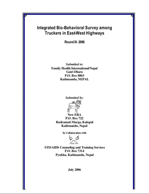 This study is the third round of the integrated bio-behavioral survey (IBBS) conducted among truckers in Pathlaiya, Bara district. The IBBS was carried out during the months of January and March 2006. The survey measured HIV and syphilis prevalence among truckers and variables which are associated with risk of HIV infection, such as condom use, sexual behaviors, knowledge of HIV/AIDS, reported cases of sexually transmitted infections (STI), STI treatment behaviors, exposure to HIV/AIDS messages and drug habits.