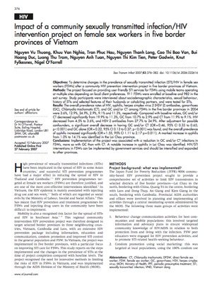 The objective of the project is to determine changes in the prevalence of sexually transmitted infection (STI)/HIV in female sex workers (FSWs) after a community HIV prevention intervention project in five border provinces of Vietnam. The project focused on providing user-friendly STI services for FSWs using mobile teams operating at multiple sites depending on local client preferences.