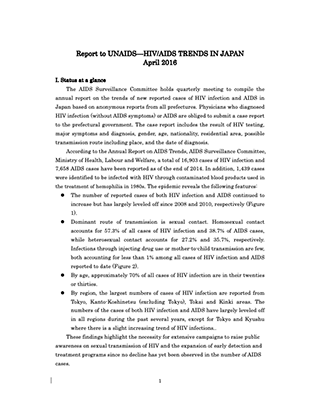 The AIDS Surveillance Committee holds quarterly meeting to compile the annual report on the trends of new reported cases of HIV infection and AIDS in Japan based on anonymous reports from all prefectures. Physicians who diagnosed HIV infection (without AIDS symptoms) or AIDS are obliged to submit a case report to the prefectural government. The case report includes the result of HIV testing, major symptoms and diagnosis, gender, age, nationality, residential area, possible transmission route including place, and the date of diagnosis.