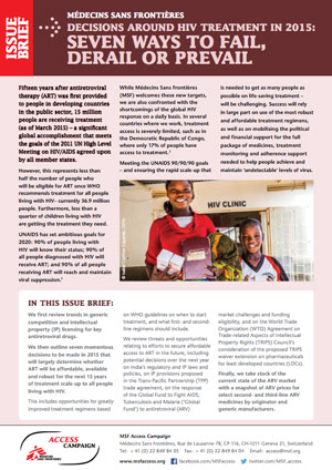 In this issue brief we first review trends in generic competition and intellectual property (IP) licensing for key antiretroviral drugs. We then outline seven momentous decisions to be made in 2015 that will largely determine whether ART will be affordable, available and robust for the next 15 years of treatment scale-up to all people living with HIV. This includes opportunities for greatly improved treatment regimens based on WHO guidelines on when to start treatment, and what first- and second line regimens should include.