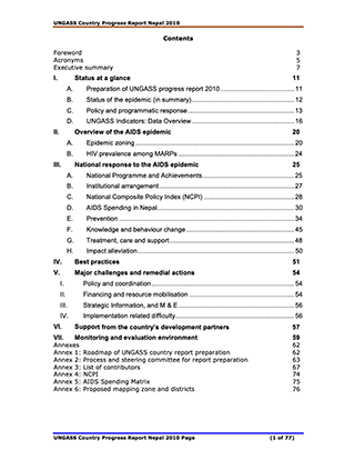 The preparation of the UNGASS country report was widely participated in by a range of sectors like civil society organisations including PLHIV, government agencies; experts group (e.g. SI-TWG); external development partners and other stakeholders. A steering committee led by the National Planning Commission provided the guidance and oversight during the report preparation process. A desk review of a number of documents, studies (e.g. IBBS), and reports was carried out to extract necessary data and information. The UNGASS Nepal Country Progress Report Nepal 2010 covers the period 2008 -2009.