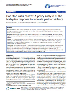 This article aims to investigate the processes, actors and other influencing factors behind the development and the national scale-up of the One Stop Crisis Centre (OSCC) policy and the subsequent health model for violence-response. Methods used included policy analysis of legal, policy and regulatory framework documents, and indepth interviews with key informants from governmental and non-governmental organisations in two States of Malaysia. The findings show that women’s NGOs and health professionals were instrumental in the formulation and scaling-up of the OSCC policy.