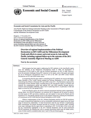 The present document aims to review the progress of the HIV response in the Asia-Pacific region, with a view to identifying the opportunities for further action afforded by the 2011 Political Declaration. In doing so, it also draws on the expressed commitments undertaken by ESCAP member States to address the HIV epidemic, including those reflected in resolutions 66/10, Regional call for action to achieve universal access to HIV prevention, treatment, care and support in Asia and the Pacific (19 May 2010) and 67/9, Asia-Pacific regional review of the progress achieved in realizing the Declaration of Commitment on HIV/AIDS and the Political Declaration on HIV/AIDS (25 May 2011).