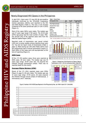 In April 2011, there were 171 new HIV Ab seropositive individuals confirmed by the STD/AIDS Cooperative Central Laboratory (SACCL) and reported to the HIV and AIDS Registry (Table 1). This was an 11% increase compared to the same period last year (n=154 in 2010) [Figure 1].