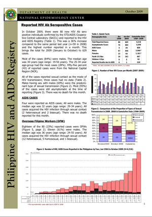 In October 2009, there were 80 new HIV Ab seropositive individuals confirmed by the STD/AIDS Cooperative Central Laboratory (SACCL) and reported to the HIV and AIDS Registry (Table 1). This was a 36% increase compared to the same period last year (n=59 in 2008) and the highest number reported in a month. This brings the total for 2009 (January to October) to 629 cases.