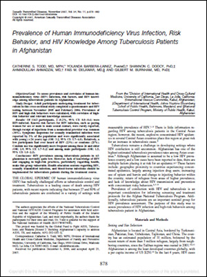HIV prevalence among tuberculosis patients in Afghanistan is currently quite low. However, lack of knowledge of HIV and engaging in high-risk practices, particularly regarding health, make this group vulnerable. Health education sessions regarding HIV, sexually transmitted infection, and blood-borne infections should be implemented for tuberculosis patients during the treatment course.
