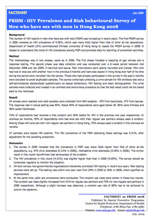 The number of HIV reports in men who have sex with men (MSM) was increasing in recent years. The first PRiSM survey in 2006 revealed an HIV prevalence of 4.05%, which was many folds higher than that of other at-risk populations. Department of Health (DH) commissioned the Chinese University of Hong Kong to repeat the PRiSM survey in 2008. It helped to understand the trend of HIV prevalence among MSM and provided data for the planning of prevention activities.