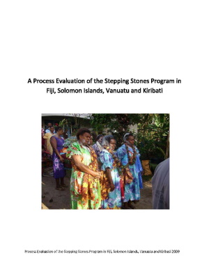 The process evaluation of the Stepping Stones (SS) program in Fiji, Solomon Islands, Vanuatu and Kiribati was conducted throughout June 2009 to January 2010 period. The aims of the evaluation were to; 1) describe and share the lessons learnt on the different processes used to deliver the program in current countries, 2) make recommendations on the future sustainability and strategic direction of the program and 3) to make recommendations on the monitoring and evaluation (M&E) methodologies to ensure accurate and reliable collection of SS data for future outcome orientated evaluations.