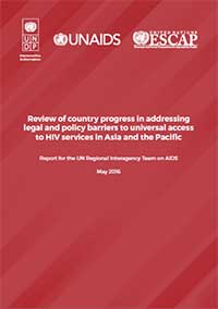 The purpose of this report is to highlight progress, challenges and future priorities in addressing legal and policy barriers to achieving universal access to HIV services in Asia and the Pacific. It will inform country preparations for the United Nations General Assembly High-Level Meeting on Ending AIDS (HLM) to be convened in New York, 8-10 June 2016, as well as subsequent actions at regional and country level towards ending AIDS, protecting human rights and achieving the SDGs.