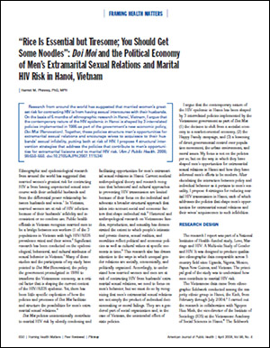 Research from around the world has suggested that married women’s greatest risk for contracting HIV is from having sexual intercourse with their husbands. On the basis of 6 months of ethnographic research in Hanoi, Vietnam, this paper argues that the contemporary nature of the HIV epidemic in Hanoi is shaped by 3 interrelated policies implemented in 1986 as part of the government’s new economic policy, Doi Moi (Renovation). Together, these policies structure men’s opportunities for extramarital sexual relations and encourage wives to acquiesce to their husbands’ sexual infidelity, putting both at risk of HIV. The study proposes 4 structural intervention strategies that address the policies that contribute to men’s opportunities for extramarital liaisons and to marital HIV risk.