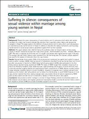 Despite the grave consequences of sexual violence, and it’s persistence both within and outside marriages, this subject has received relatively little attention from researchers, policy makers, and programme managers in Nepal. This paper explores the definition of sexual violence and its various forms and consequences as reported by young married women in Nepal. In addition, it describes the coping mechanisms used by young married women to avoid sexual violence perpetrated against them by their husbands.